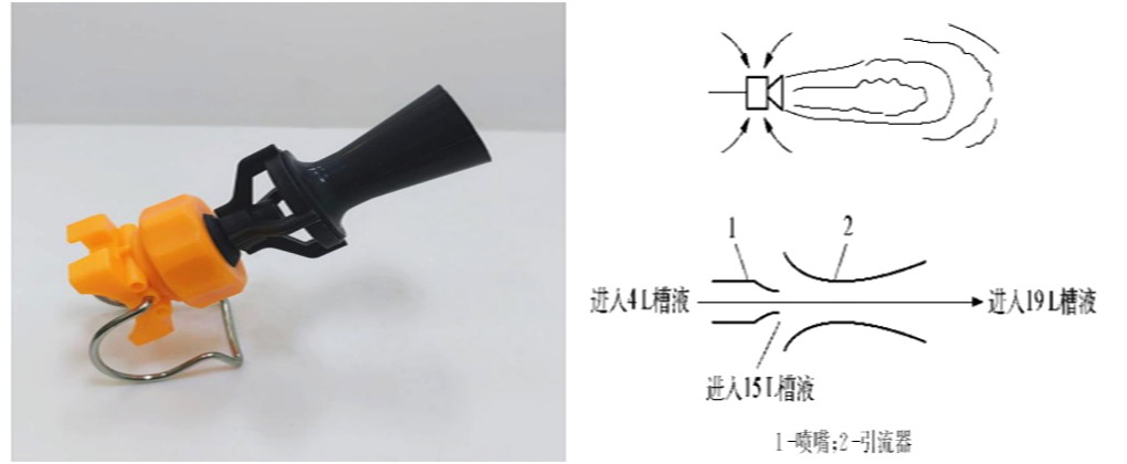 噴嘴是一種用于控制流體流動(dòng)方向和速度的裝置,廣泛應(yīng)用于工業(yè)、農(nóng)業(yè)、汽車(chē)等多個(gè)領(lǐng)域。電泳槽中常常使用噴嘴實(shí)現(xiàn)槽液循環(huán)攪拌,確保涂料均勻分散,防止顏料沉淀至槽底而降低固體份,同時(shí)避免顏料沉降在被涂物上影響表面質(zhì)量。常規(guī)噴嘴在壓力損失、流量控制及混合效率上存在局限,為達(dá)到更好的循環(huán)效果,在循環(huán)攪拌管上安裝引流噴嘴,利用文丘里原理,通過(guò)引流器噴出槽液量擴(kuò)大3-4倍。 ?工作原理:文丘里噴嘴利用了文丘里效應(yīng)。當(dāng)槽液主循環(huán)泵提供的高壓液體流經(jīng)噴嘴的狹窄喉部時(shí),流速急劇增加,根據(jù)伯努利原理,這會(huì)在此處產(chǎn)生一個(gè)低壓區(qū)域。 ?“吸力”的產(chǎn)生:這個(gè)低壓區(qū)就像一個(gè)真空吸力點(diǎn),會(huì)通過(guò)噴嘴側(cè)后方或側(cè)面的開(kāi)口(吸入口)大量吸入電泳槽底部或周?chē)牟垡骸?/p>